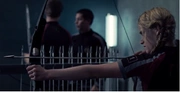 The District 10 male grabs her arm. Glimmer punches his face, grabs him by the back of his neck and pins him onto a crate and tries to slash him many times but he is too quick for her. The District 6 male pushes her to the ground, making Glimmer scream. He is about to kill her when Cato pushes him away. Glimmer grabs a sword and watches as Cato kills the District 6 male. She then walks inside to look for supplies, like the bow waiting for her outside.